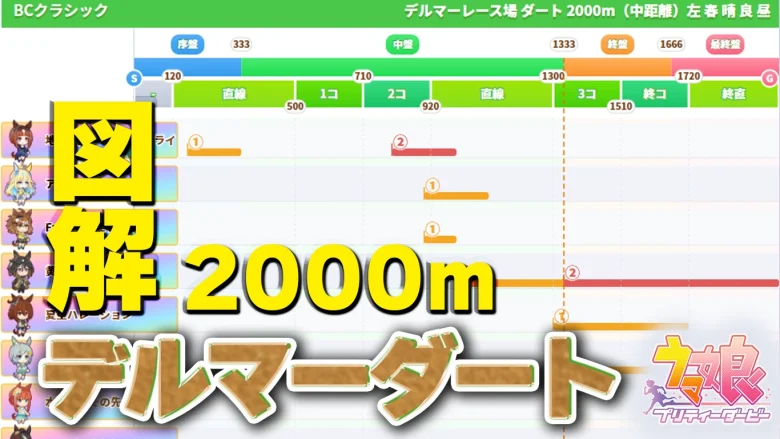 ウマ娘2026年4月チャンミ デルマーレース場図面解説 BCクラシックデルマーレース場 ダート 2000m(中距離)左 春 晴 良 昼 序盤中盤終盤最終盤33313331666 -直線1コ2コ直線3コ終コ終直SG 120500710920130015101720 地熱解放オーヴァードライブ①②アド・アス... -